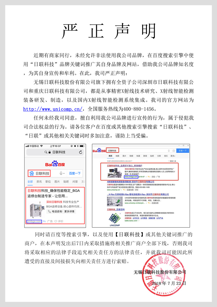 关于使用“日联科技”品牌关键词的严正声明