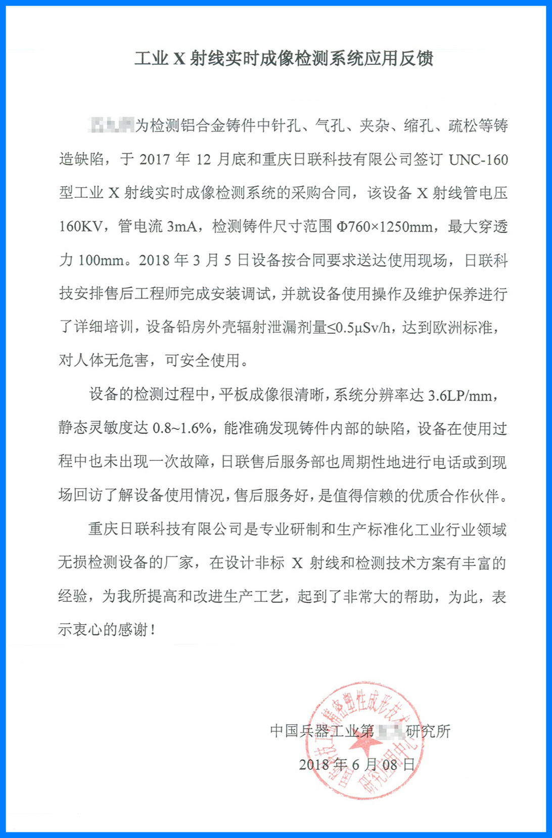 近日,日联科技收到了中国兵器工业集团反馈的用户使用报告。在该报告中,中国兵器工业集团对我司设备稳定可靠的工作性能、专业细致的售后服务、完善详尽的操作培训给予了高度的认可和评价,并重点指出我们的UNC160工业X射线实时成像检测设备能准确发现铸件的内部缺陷,为他们产品质量的提高和生产工业的改进提供了可靠保障,称赞我们日联科技为值得信赖的企业合作伙伴。