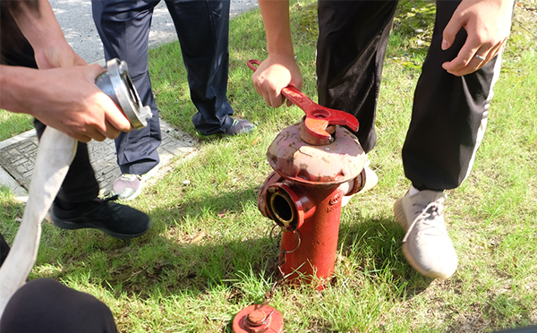 随着警报声响起,各部门员工在紧急小组成员们带领下进行有序疏散撤离,到达安全区域后人员按部门整齐站队,各部门负责人清点人数并报告撤离情况,紧接着开展了灭火器、消防栓、急救包等各项灭火救援器材的实战演练。